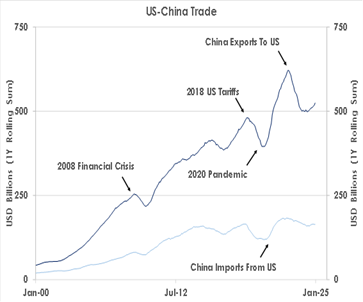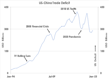 Pada tahun 2024, ekspor China ke AS sebesar US$525 miliar seperti yang ditunjukkan pada grafik (hampir sebesar 3% dari PDB China). Namun, setelah AS menetapkan tarif terhadap produk ekspor China, investor tidak terlalu khawatir, karena respon China hanya terbatas pada empat target kategori.