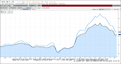 Indeks PCE bulan April dirilis pada 4.4%, sedikit mengalami kenaikan dibandingkan bulan sebelumnya di 4.2%. Akan tetapi angka ini sudah mengalami penurunan yang cukup banyak dibandingkan tingkat tertingginya pada Juni 2022 yang mencapai 7%.