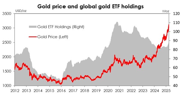 Since mid-2024, gold Exchange Traded Fund (ETF) outflows have reversed, marking a shift in trend from recent years. Despite gold ETF inflows gaining momentum, total holdings globally remain well below the record highs reached five years ago, suggesting there is ample room for this trend to extend. Investors could continue to buy gold as a portfolio hedge against stagflation risk as uncertainty related to tariff policies are likely to remain elevated.