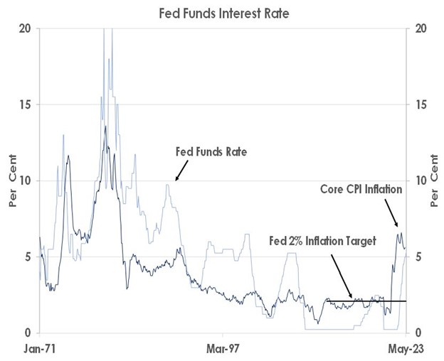 This month, the Fed lifted its fed funds rate for the tenth meeting in a row by 25bps to 5.00-5.25%. The last chart shows the rate is at its highest level now since 2007. But the chart also shows core inflation remains far above the Fed’s 2% target as the tight jobs market keeps wage growth strong.