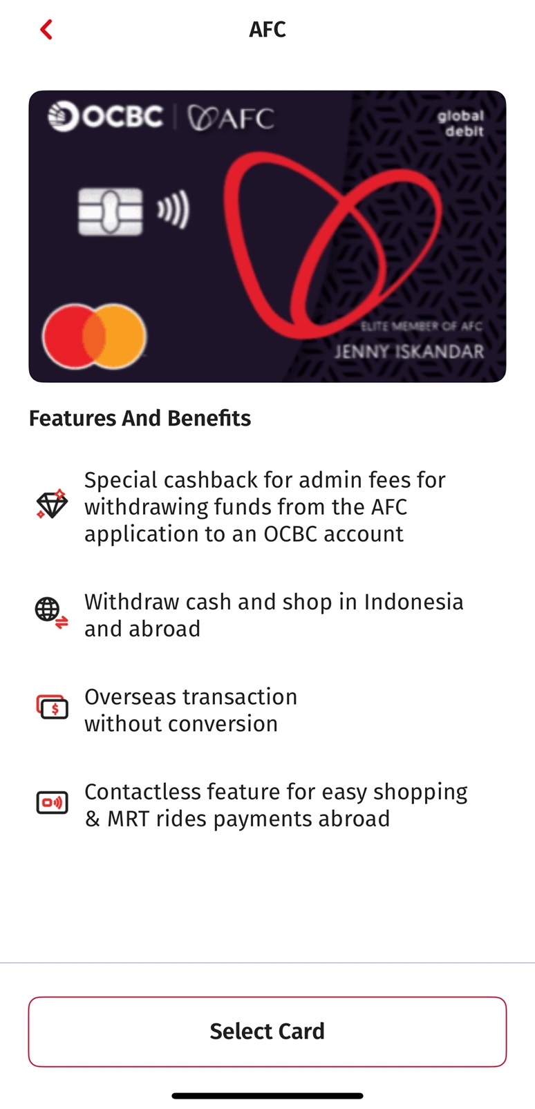 For OCBC existing Customer can get AFC Global Debit by opening Tanda 360 Savings Account through OCBC mobile.