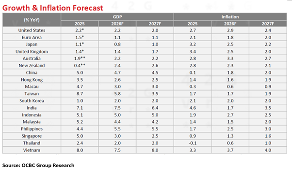 OCBC Group Research maintains its base case for one 25bps fed funds rate cut in 2026 and has pencilled in this expected cut for 1Q26. Thereafter, any additional fed funds rate cuts will probably require inflation to move nearer to Fed’s 2% target.