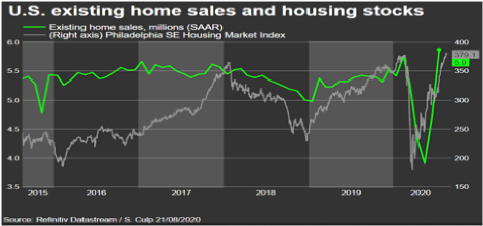 Rilisan data ekonomi AS yang positif mendorong penguatan pasar. Tingkat penjualan rumah di AS melonjak 24.7% secara bulanan, sehingga tercatat sebanyak 5.86 juta unit terjual pada bulan Juli 2020. Angka tersebut merupakan kenaikan tertinggi sepanjang sejarah sejak bulan Desember 2006. Kondisi ini tentunya dipengaruhi tingkat suku bunga pinjaman AS yang relatif rendah, sehingga mendorong appetite konsumen di sektor properti. Sama halnya dengan pertumbuhan di sector manufaktur dan jasa yang melaporkan pemulihan yang lebih cepat dari yang diperkirakan, berdasarkan survey awal dari Markit US Manufacturing PMI, sector manufaktur naik ke level 53.6 di bulan Agustus dari 50.9 di bulan Juli, dan mengalahkan estimasi pasar di 51.9. Meningkatnya permintaan akan barang seiring meningkatnya aktivitas ekonomi paska pelonggaran karantina wilayah menjadi salah satu faktor yang mendorong kenaikan di sektor manufaktur. Sama halnya dengan sektor jasa yang juga menunjukan akselerasi pemulihan, tercermin dari survei Markit US Service PMI yang berada di level 54.8 di bulan Agustus yang merupakan level tertinggi sejak Maret 2019, meningkat dari level 50.0 di bulan Juli. Pemulihan di sektor jasa juga didorong dari peningkatan aktivitas ekspor dan perbaikan di sektor ketenagakerjaan.