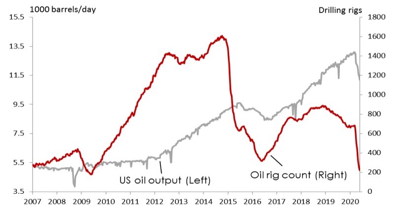 Production cuts outside of OPEC have been swift, albeit painfully and reactively. In the US, the world’s largest oil producer, active oil rigs have plummeted to just 222, the lowest total since 2009. The stronger bounce for WTI compared to Brent, leading to a substantial tightening of the WTI - Brent spread, points to the broader rebalancing of the US oil market. Assuming average prices continue to edge up in 2H20, questions will grow as to whether and how quickly US shut-in production will be turned back on. The rally in WTI prices has already encouraged a number of operators to start bringing shut-in wells back online.