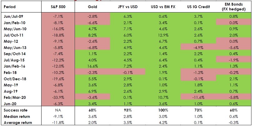Source: Bloomberg, Bank of Singapore, JP Morgan; as at 26 June 2020 Note: Chart shows returns on hedges during largest S&P500 drawdowns since 2009. S&P500 drawdown calculated as maximum peak-to-trough move during period. Returns on other asset classes defined as total return over that same period. Green shading indicates positive return on hedge during equity decline. EM = Emerging Market. IG = Investment Grade. The information presented is historical information and past performance is not a guarantee or indication of future results