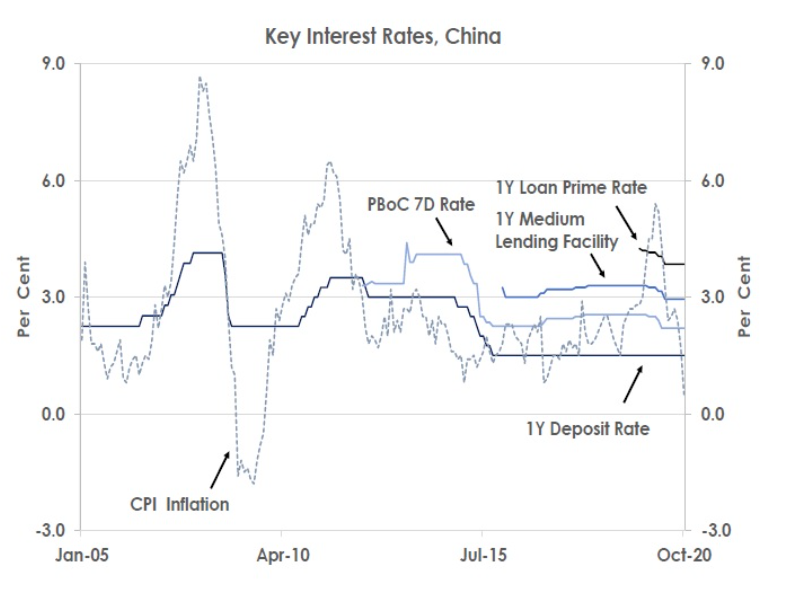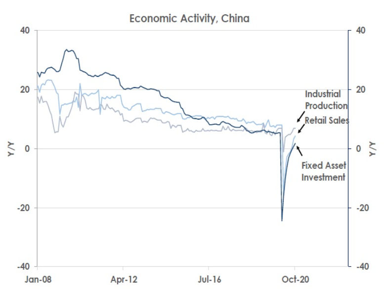 October’s monthly activity data shows China’s V-shaped recovery continues to strengthen at the start of Q4’20 with industrial production, retail sales and fixed asset investment rising by 6.9%YoY, 4.3%YoY and 1.8%YoY, respectively.