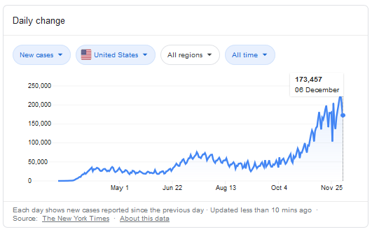 Amerika Serikat, pada hari minggu lalu melaporkan penambahan kasus harian COVID-19 sebanyak 176 ribu kasus, sedikit di bawah rekor tertinggi pada hari Jumat sebelumnya di 228 ribu kasus, sehingga rata – rata penyebaran harian saat ini menyentuh kisaran 200 ribu kasus per hari. AS telah mencapai 20% dari total penyebaran kasus secara global, dengan korban meninggal dunia sebanyak 282 ribu jiwa. Kondisi ini juga diiringi dengan peningkatan pemakaian jumlah fasilitas kesehatan rumah sakit dan fasilitas gawat darurat, yang telah menyentuh rekor tertinggi sebanyak 101,487 orang yang sedang dirawat. Jumlah tersebut diperkirakan akan terus bertambah, sebagai dampak dari hari libur Thanksgiving, dan memasuki kondisi musim dingin.