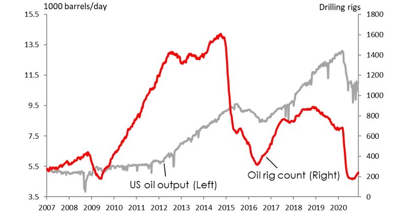 A significant revival of US shale oil output looks unlikely until 2H 2021, at the earliest after months of minimal capital spending. US oil production is also likely to see limited growth under Biden’s presidency, although fears of a “Green New Deal” that severely limits and/or raises the regulatory cost of US oil production seem exaggerated.