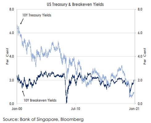 Financial markets have responded strongly. The first chart shows 10Y US Treasury yields have hit 1.00% for the first time since March 2020 when 10Y US Treasury yields fell to 0.31%. Inflation expectations have also increased with 10Y breakeven rates rising above 2.00%. Brent oil has jumped from USD50 to USD54 and copper has reached USD8,000 for the first time in eight years.