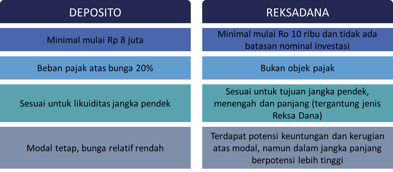 Saat ini, banyak sekali instrumen investasi, mulai dari yang berisiko rendah seperti deposito, sampai yang berisiko tinggi seperti saham. Nah, kali ini kita mau membahas mengenai Reksa Dana, yang merupakan salah satu instrumen investasi yang cukup familiar dan cocok bagi semua kalangan. Sebelumnya, yuk lihat dulu perbandingan deposito dengan Reksa Dana!