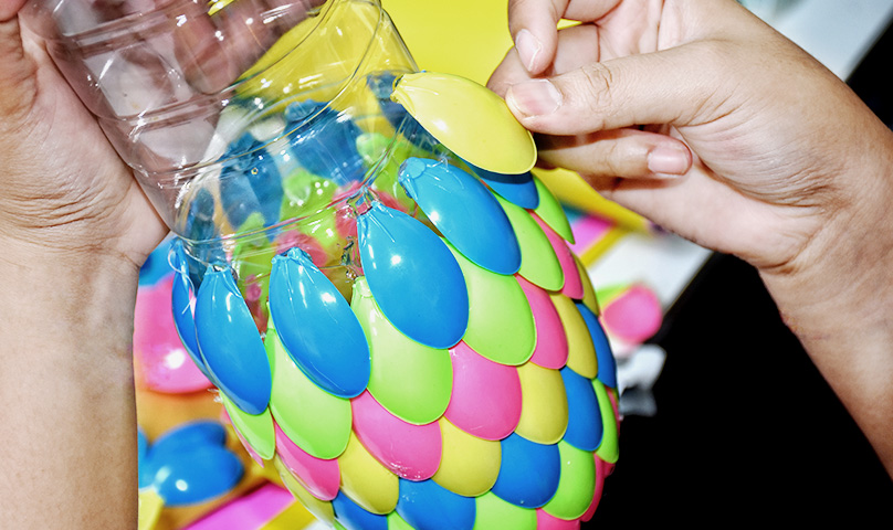 Daripada membuat tempat makanan dan minuman bekas menjadi sampah, lebih baik menjadikannya tempat sampah. Cara daur ulang sampah botol plastik tidak hanya memanfaatkan beberapa bagiannya saja, tapi seluruh bagian botol plastik bekas juga bisa bermanfaat. Botol bekas disusun lalu dibentuk sebagai tempat sampah yang berwarna-warni. Cara membuat kerajinan botol plastik untuk tempat sampah ini cukup mudah, kamu hanya memerlukan banyak botol bekas serta lem perekat untuk menyusun semua tutup botol menjadi tempat sampah.