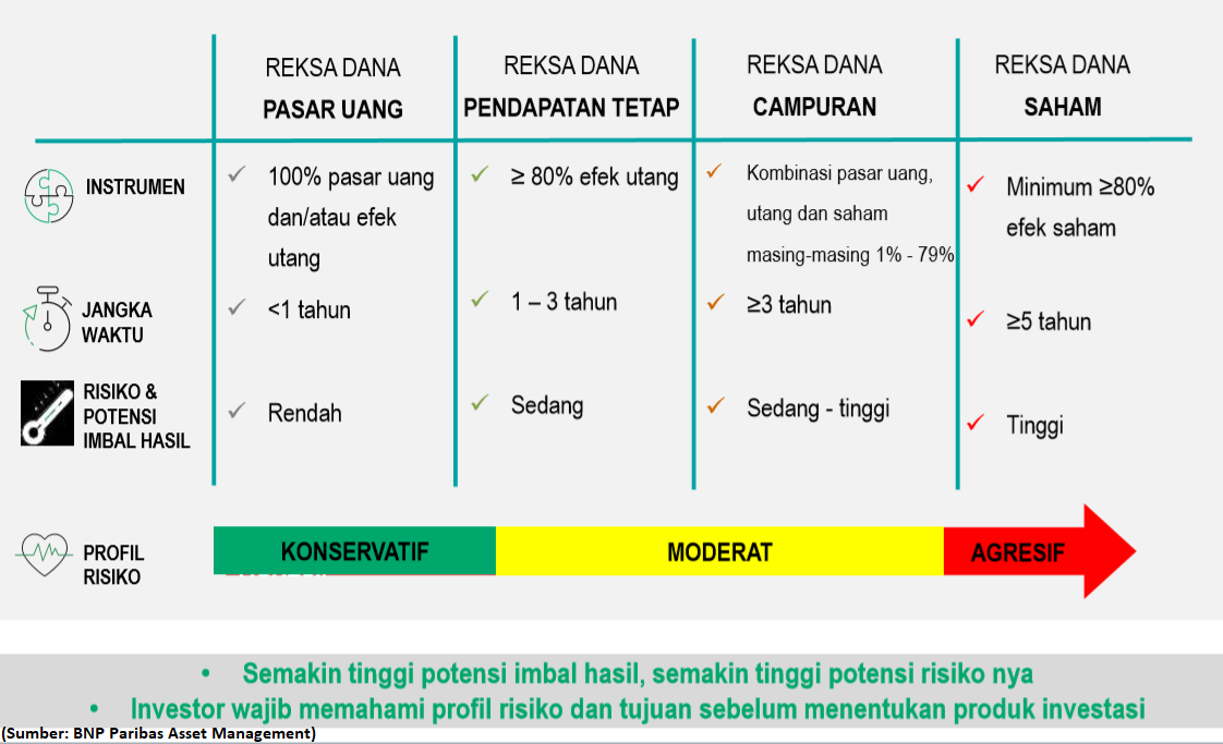 Dengan investasi di reksa dana, kamu gak perlu repot memilih obligasi atau saham mana sih yang bagus untuk dibeli, karena sudah ada Manager Investasi (MI) yang punya keahlian khusus untuk melihat bibit, bebet, bobot suatu obligasi atau saham. MI tersebut bisa mengalokasikan dana kamu keberbagai instrument investasi yang punya potensi menguntungkan. Lalu, reksa dana mana yang cocok untuk kamu?