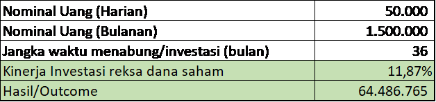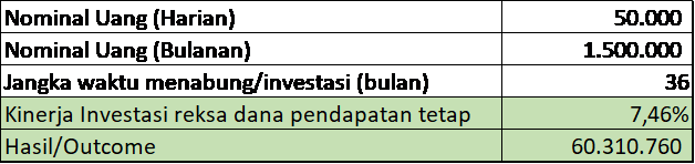 Untuk mempersiapkan DP, simulasi investasi dengan reksa dana sebesar Rp 1.500.000 per bulan, dalam waktu 3 tahun, bisa tumbuh hingga Rp.60 jutaan lho. Semakin kamu cepat memulai, semakin uang muka kamu cepat terkumpul.