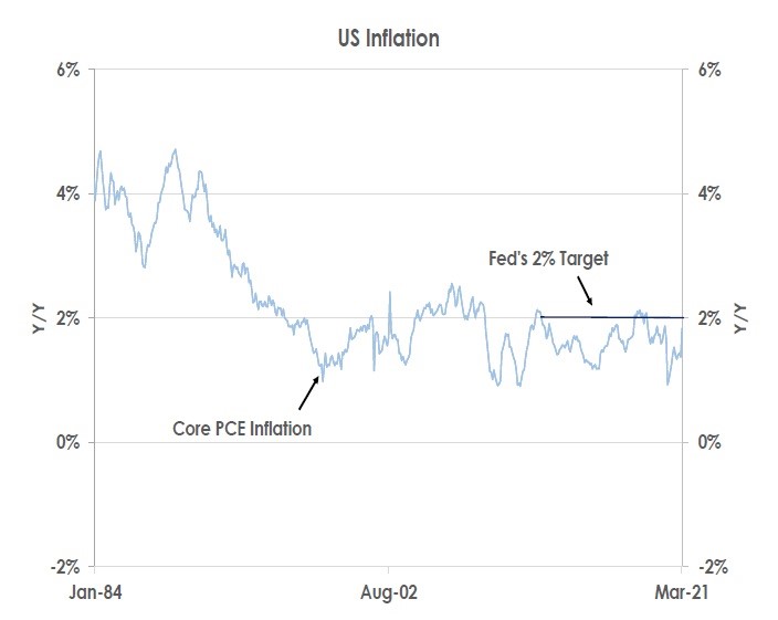 The chart shows the Fed’s target measure of inflation - changes in core personal consumption expenditure (PCE) prices - has started to pick up as the economy rebounds. In March core PCE inflation increased from 1.4%YoY to 1.8%YoY.