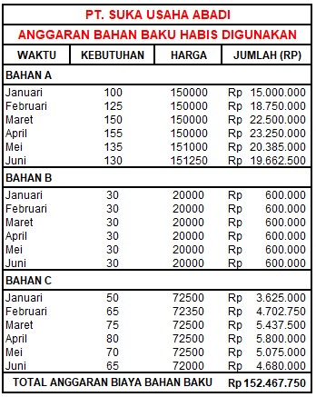 Di bawah ini merupakan contoh anggaran keuangan bahan baku selama 6 bulan ke depan dari PT. SUKA USAHA ABADI.