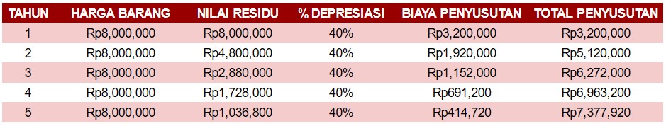 % Depresiasi berganda = 2 X 20% = 40%Maka, biaya penyusutan per tahunnya adalah:
