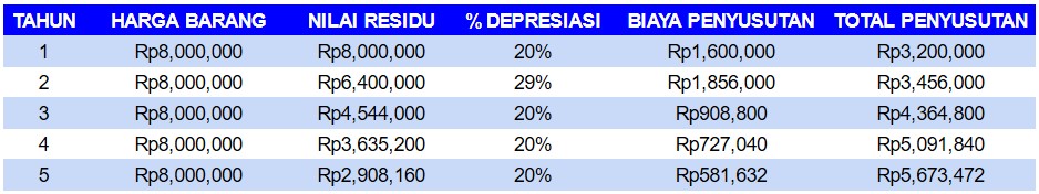 Perusahaan A ingin menjual 1 mesin produksi seharga Rp8 juta dalam 5 tahun mendatang, dengan estimasi nilai residu saat dijual adalah Rp1 juta. Jika menggunakan metode saldo menurun ganda, biaya penyusutannya yaitu sebagai berikut:% Depresiasi per tahun = â…• tahun X 100% = 20%