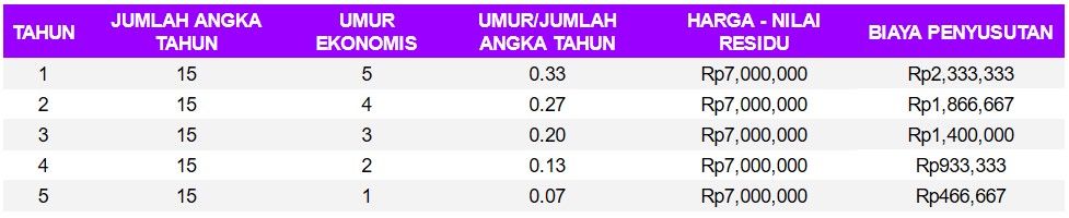 p> Jumlah angka tahun = 1+2+3+4+5 = 15Maka perhitungan biaya penyusutan per tahunnya adalah: