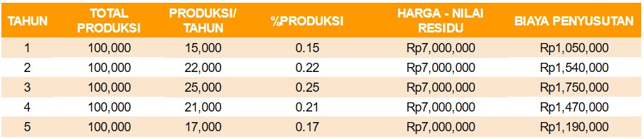 Dengan demikian, jika perusahaan A ingin nilai residu saat dijual adalah Rp1 juta, maka total biaya depresiasi wajib ada di angka Rp7 juta, dengan biaya penyusutan dan jumlah produksi per tahun seperti tertera di atas.