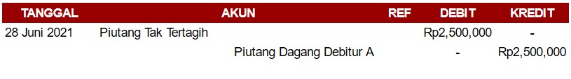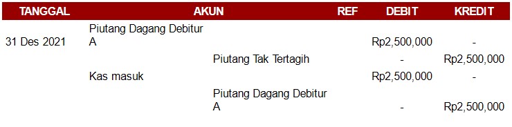 Akan tetapi, ternyata pada 31 Desember 2021, debitur A bisa membayar piutang tak tertagihnya. Dengan demikian, PT. ALFA JAYA wajib mengeluarkan piutang tidak tertagih dari akun debit perusahaan, seperti berikut ini.