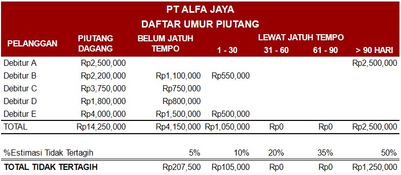 PT. ALFA JAYA punya daftar umur piutang dengan estimasi piutang tak tertagih sebagai berikut: