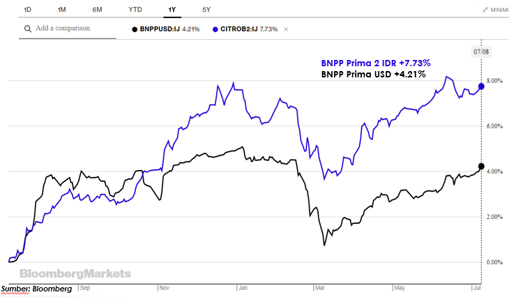 Pada gambar di atas ini, menjelaskan perbandingan kinerja RDPT pada BNP Paribas Prima 2 (IDR) vs BNP Paribas Prima USD, dimana selama 1 tahun terakhir mulai dari 8 Juli 2020 – 8 Juli 2021 mencatatkan kinerja BNP Paribas Prima 2 (IDR) sebesar 7.73%, lebih tinggi dari pada BNP Paribas Prima USD sebesar 4.21%. Wah, lebih cuan yang IDR yah? Eits, belum tentu, berinvestasi dengan denominasi USD selain untuk diversifikasi aset, juga sebagai salah satu cara untuk menghindari inflasi. Jika Anda berinvestasi dengan tujuan jangka panjang dan tidak ingin nilai investasi tergerus oleh inflasi, Anda dapat membagian sebagian porsi investasi ke dalam investasi denominasi USD. Nah, untuk Anda yang sudah memiliki tabungan dalam USD, dapat dimaksimalkan dalam RDPT USD, mengingat bunga tabungan atau deposito USD yang hampir 0%.