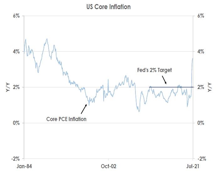 Third, the Fed Chair discussed why this year’s increases in inflation - the chart shows changes in core personal consumption expenditure (PCE) prices at 3.6% in July were well above the Fed’s 2% target - are still likely to be only temporary.