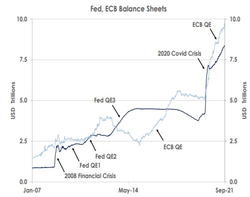 We expect the ECB will slow its monthly bond buying to EUR60 billion in Q4’21 from EUR80 billion in Q2’21 and Q3’21. Thus, it will likely return to its same pace as Q1’21 as the first chart shows.