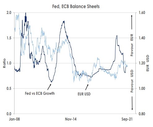 The ECB’s prolonged printing of money will keep benefiting Eurozone equities but weigh on the EUR. The last chart shows the exchange rate tends to follow the relative pace of quantitative easing between the Fed and the ECB over time. If ECB bond buying outlasts the Fed’s, the EUR will struggle to rally longer term. Our new 12 month forecast here is 1.18 for the EUR against the USD.