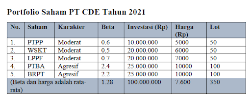 Berikut contoh portofolio investasi saham milik perusahaan PT CDE di tahun 2021. Dari portofolio tersebut diketahui bahwa PT CDE telah menanamkan modal pada 5 jenis perusahaan yaitu, PTPP, WSKT, LPPF, PTBA dan BRPT.