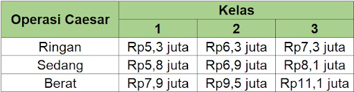 Besarnya biaya operasi caesar yang ditanggung oleh BPJS tergantung dari jenis kelas, tingkat kesulitan operasi serta fasilitas perawatan yang diterima pasien. Berikut daftar kisaran besaran biaya yang ditanggung BPJS.