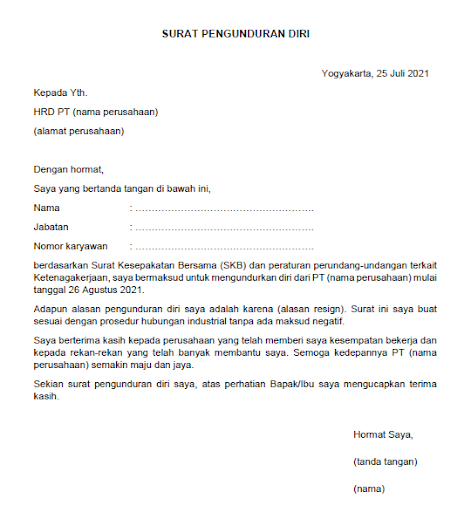 Format surat resign biasanya hampir sama, yakni berisi identitas, tanggal resign kerja, alasan resign, dan apresiasi serta harapan untuk perusahaan. Cara membuat surat resign pun cukup mudah, Anda hanya perlu mengikuti format pada contoh berikut ini.