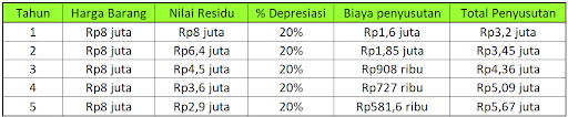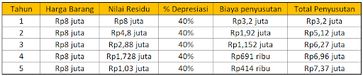 Dengan contoh persoalan yang sama seperti sebelumnya, jika menggunakan metode saldo menurun ganda, maka biaya penyusutan aset tetap adalah sebesar..
