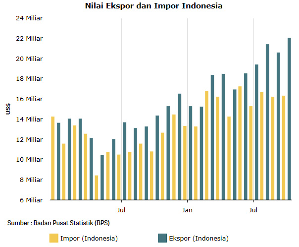 Badan Pusat Statistik (BPS) melaporkan neraca perdagangan Indonesia periode Oktober 2021 yang kembali mencatatkan surplus sebesar USD 5.74 miliar. Indonesia telah melaporkan surplus perdagangan selama 18 bulan berturut-turut. Sebagai rincian, impor naik +0.36% MoM dan +51.06% YoY, dengan capaian sebesar USD 16.29 miliar. Sementara ekspor naik +6.89% MoM dan +53.35% YoY dengan capaian sebesar USD 22.03 miliar.