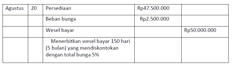 Pada tanggal 20 Agustus 2021 PT DFG mengeluarkan wesel bayar 150 hari (5 bulan) dengan nilai Rp50 juta untuk PT JKL. Dana ini digunakan untuk pembelian bahan baku produksi. PT JKL memberikan diskonto 1% per bulan (sebesar Rp2.5 juta) yang didebet ke dalam beban bunga sehingga hasil yang diperoleh adalah Rp47.5 juta dan langsung di debit ke dalam persediaan.