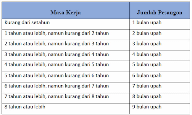 - Cocokkan masa kerja tersebut dengan nominal yang telah ditetapkan Undang-Undang Cipta Kerja sebagaimana terdapat dalam tabel berikut.