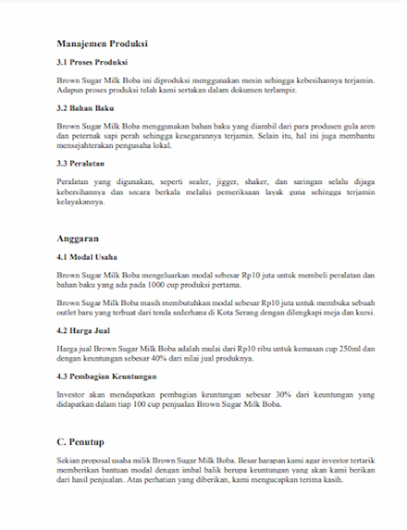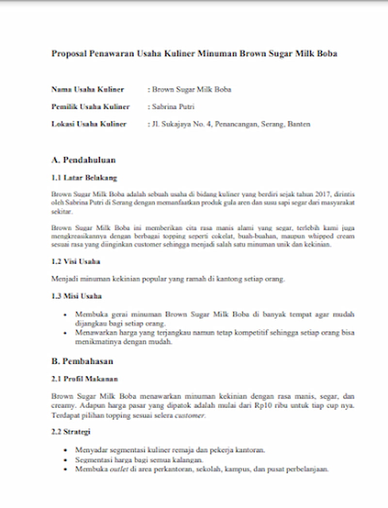 Agar lebih memahami uraian di atas, berikut ini contoh proposal usaha sederhana. Anda cukup menambahkan beberapa lampiran yang dirasa penting untuk diketahui calon investor.