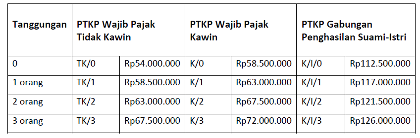 Sebagai catatan, PTKP individu adalah Rp54 juta per tahun, sedangkan apabila ia telah menikah PTKP tersebut akan ditambah Rp4.5 juta. Demikian pula jika ia memiliki tanggungan keluarga sedarah, maksimal 3 orang.