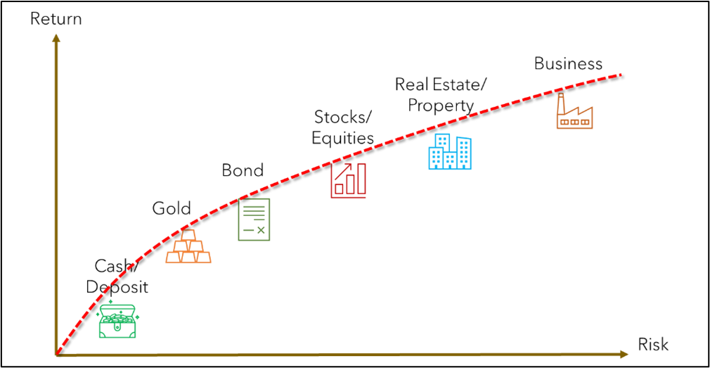 Sedangkan pasar saham, properti, hingga memiliki usaha sendiri merupakan jenis – jenis investasi yang masuk dalam kategori High Risk – High Reward.