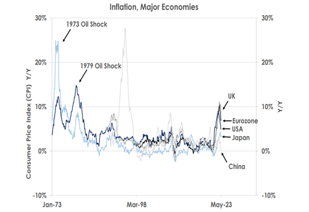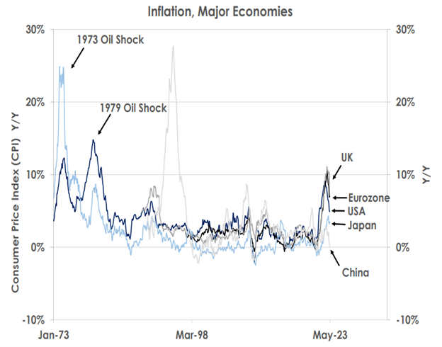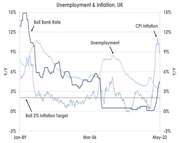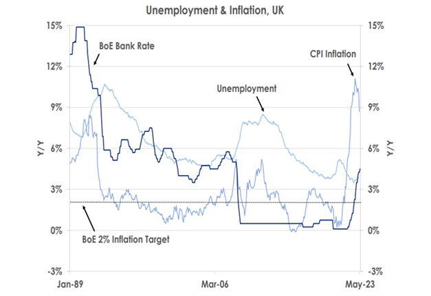 UK inflation is being driven by the rising costs of core goods and services and by stronger wage growth. The chart above shows unemployment is just 3.9% despite the BoE increasing interest rates from 0.10% in 2021 to 4.50% now. The tight labour market has caused weekly earnings to rise 6.7% over the past year, further fuelling inflation.