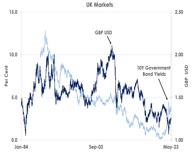 Second, we think the BoE will need to engineer a recession to curb inflation. We forecast the GBP to stay below 1.25 against the USD over the next 6 months and GDP to shrink 0.3% in 2023, keeping us cautious on the UK economic outlook.