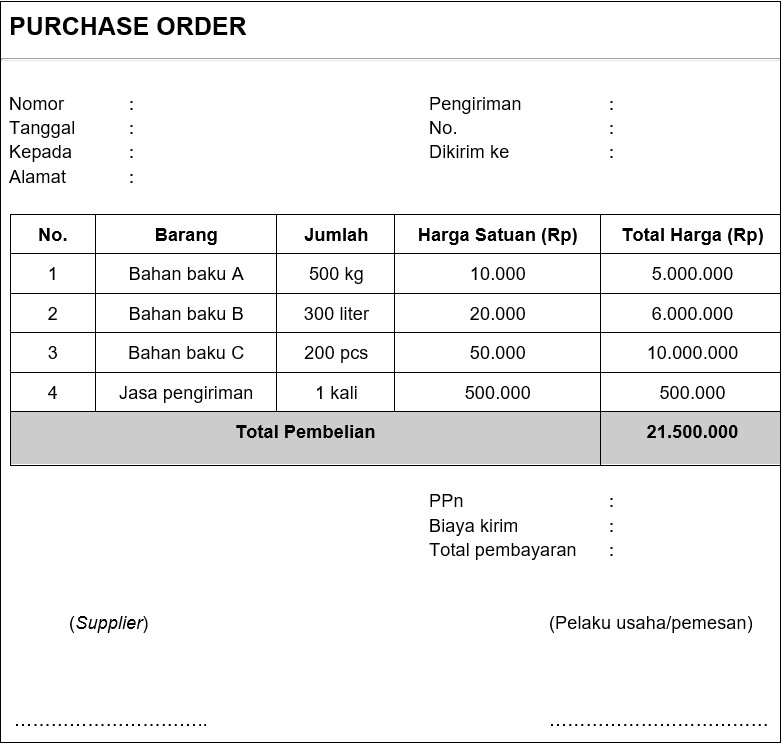 Seperti yang sudah disebutkan sebelumnya, purchase order adalah form yang diserahkan oleh pelaku usaha ketika melakukan pemesanan barang untuk keperluan produksi.