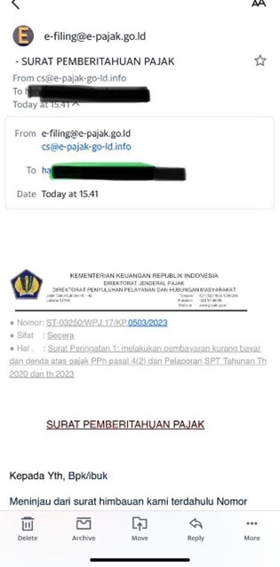 - Menerima email berupa tagihan kurang bayar pajak yang dikirimkan oleh bukan akun resmi pajak seperti e-filing@e-pajak.go.id, dll kemudian diminta untuk segera melakukan konfirmasi ulang mengenai bukti potong pajak penghasilan yang dikirimkan dalam bentuk dokumen PDF.