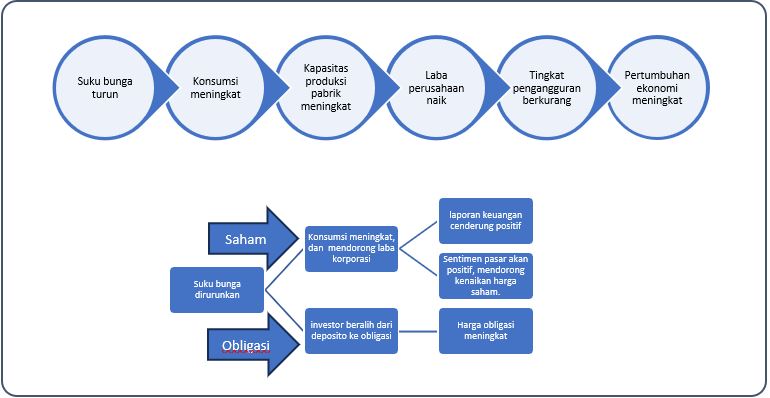 - Saat suku bunga turun, nilai mata uang cenderung melemah, sehingga ekspor lebih kompetitif, dan mendorong laba perusahaan multinasional, dan pada akhirnya juga berdampak positif terhadap harga saham.