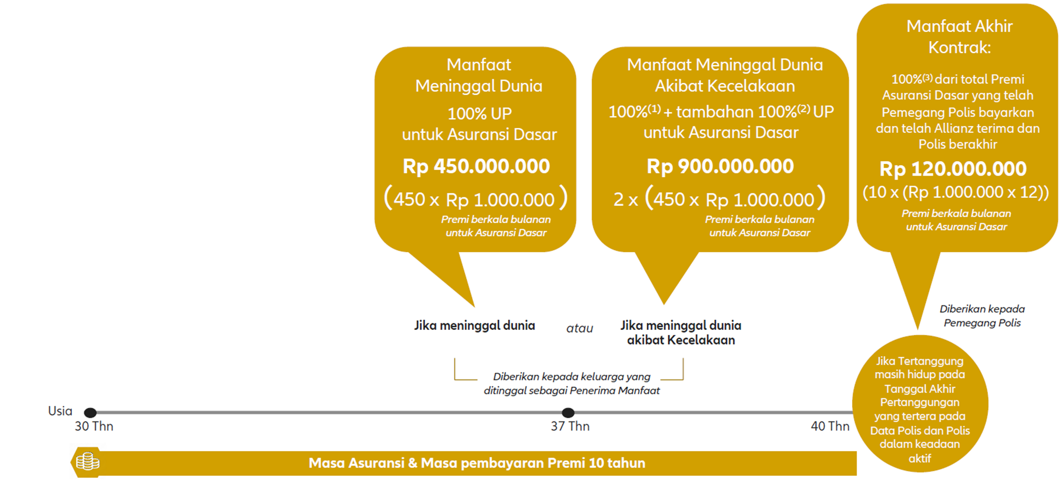 - Apabila pada usia 37 tahun Tertanggung meninggal dunia Akibat Kecelakaan, maka akan memperoleh Manfaat Meninggal Dunia Akibat Kecelakaan 100% + 100% Uang Pertanggungan untuk Asuransi Dasar Rp 900,000,000 (2 x (Rp 450 x Rp 1,000,000)); atau