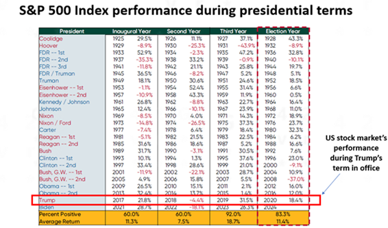 Melihat kinerja indeks S&P 500 selama masa kepresidenan Trump tahun 2017-2020 memvalidasi hal ini. Indeks membukukan kenaikan 21.8% pada tahun pelantikannya, didorong oleh pemotongan pajak. Diikuti dengan penurunan 4.4% pada tahun berikutnya, akibat perang dagang yang dimulai Trump terhadap China. Namun, selama dua tahun terakhir masa kepresidenan Trump, indeks S&P 500 kembali pulih dan membukukan keuntungan masing-masing sebesar 31.5% dan 18.4%. Jadi, volatilitas pasar saham AS bergerak hampir 70% di bawah kepemimpinan Presiden Trump.