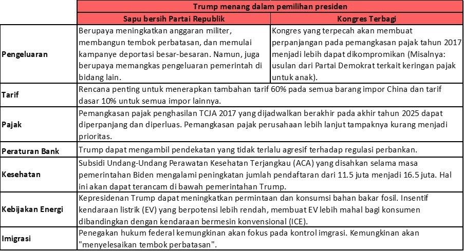 Pada saat yang sama, prospek kontrol imigrasi yang lebih ketat dan tarif yang lebih tinggi juga cenderung meningkatkan tekanan inflasi. Diperkirakan usulan tarif baru Trump akan menghasilkan tarif sebesar USD587 miliar, dibandingkan dengan tarif sebesar USD113 miliar yang berlaku selama pemerintahan pertamanya.