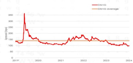 Kami juga menyoroti bahwa tingkat spread IG DM juga berada pada level ketat historis, yang menyediakan penyangga terbatas terhadap suku bunga yang lebih tinggi (lihat Lampiran 4).