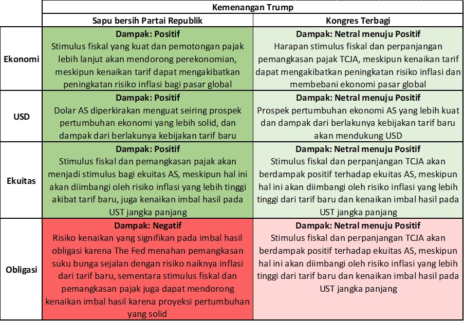 Akhirnya, kemenangan Trump, terutama kemenangan besar, diperkirakan akan mendukung Dolar AS karena prospek pertumbuhan AS yang lebih kuat, menurunnya ekspektasi penurunan suku bunga Fed, dan dampak tarif karena permintaan impor menurun.