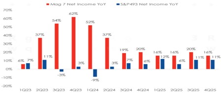Ke depannya, kami percaya bahwa pasar ekuitas akan bertahan karena pelebaran reli di luar Big Tech ke seluruh S&P 500 mengingat lintasan pendapatan yang menguntungkan bagi S&P 493 di luar Magnificent-7 [lihat Lampiran 2].